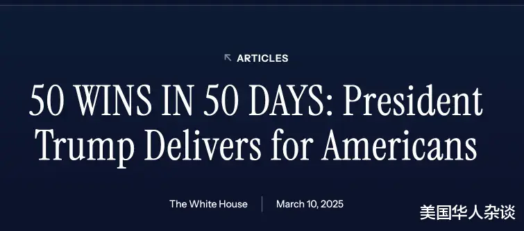 这两个月里美国发生了什么,我就不去详列了。反正每日都有大新闻,目不暇接,一惊一乍,把你的认知上限与下限一同刷新。白宫网页的大标题是:《50天赢得50场胜利!川普总统对美国人民的贡献》。