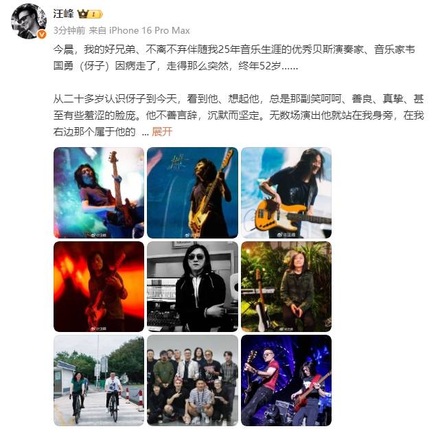 2025年8月15日,北京的天空一如往日般灰蒙,一场猝不及防的告别骤然撕裂了音乐圈的平静。汪峰在社交平台上沉痛宣告:他并肩二十五载的音乐战友、52岁的杰出贝斯手韦国勇(伢子),于今晨溘然长逝。这位总是站在汪峰舞台右侧、怀抱贝斯默默支撑旋律根基的伙伴,生命乐章竟在知天命之年戛然而止。