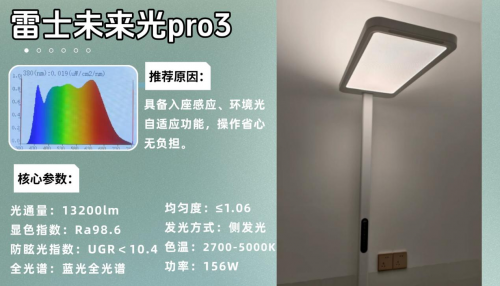 护眼落地灯品牌排行前十名有哪些?雷士未来光pro3护眼大路灯搭载156W大功率与进口普瑞全光谱光源,总光通量达13200lm,可轻松覆盖大空间,提供均匀柔和的照明环境。不过光通量太高,在近距离使用时可能需要适当调低亮度以避免光线过强影响舒适度。