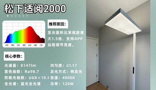 护眼落地灯品牌排行前十名有哪些?松下适阅2000护眼大路灯采用上下双向发光的形式。其中,上发光亮度达4425lm,下发光为3722lm,能够覆盖15㎡以下的空间,有效消除照明区域的暗角,不过如果是客厅这种大空间照明可能相对不足。在护眼方面,防眩光指数UGR≤10.1,光线柔和且舒适,减少长时间用眼带来的疲劳感。