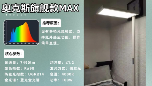 功能上也很贴心,搭载智能感光调节和入座感应,能自动维持舒适照度,不用手动频繁调整;还支持离线语音控制,操作简单。直发光设计结合高效光学透镜,进一步提升光线均匀度,实测桌面照度远超国AA级标准。但需留意的是,其直发光设计使得光线相对较强,长时间使用可能会因眩光感对眼睛造成不适。整体而言,这款大路灯是适合追求实用功能的家庭的选择。