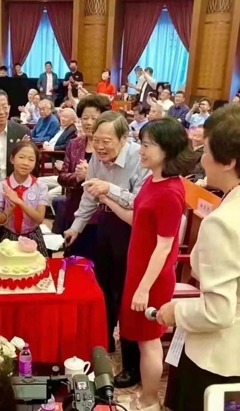 杨振宁和翁帆夫妇参加了一个朋友聚会。这位女士的蓝色外套搭配黑色裙子显得端庄优雅。他们之间的状态有很大的不同。一个虽然穿着整齐干净,但是老了很明显。每个人起床敬酒的时候都有明显的区别,而女人的穿着虽然简单却落落大方,尤其是搭配短发风格,简直就是大家闺秀的代表。她优雅、朴素、端庄、大方,很有名。