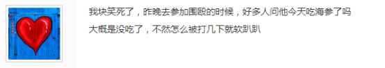 甚至还有玩家爆料,当时不少参与围殴的玩家还在嘲讽他“还吃海参吗?”这都是因为之前有采访爆料称男足的队员声称自己坚持吃海参,一天还吃两根,身体很好……
