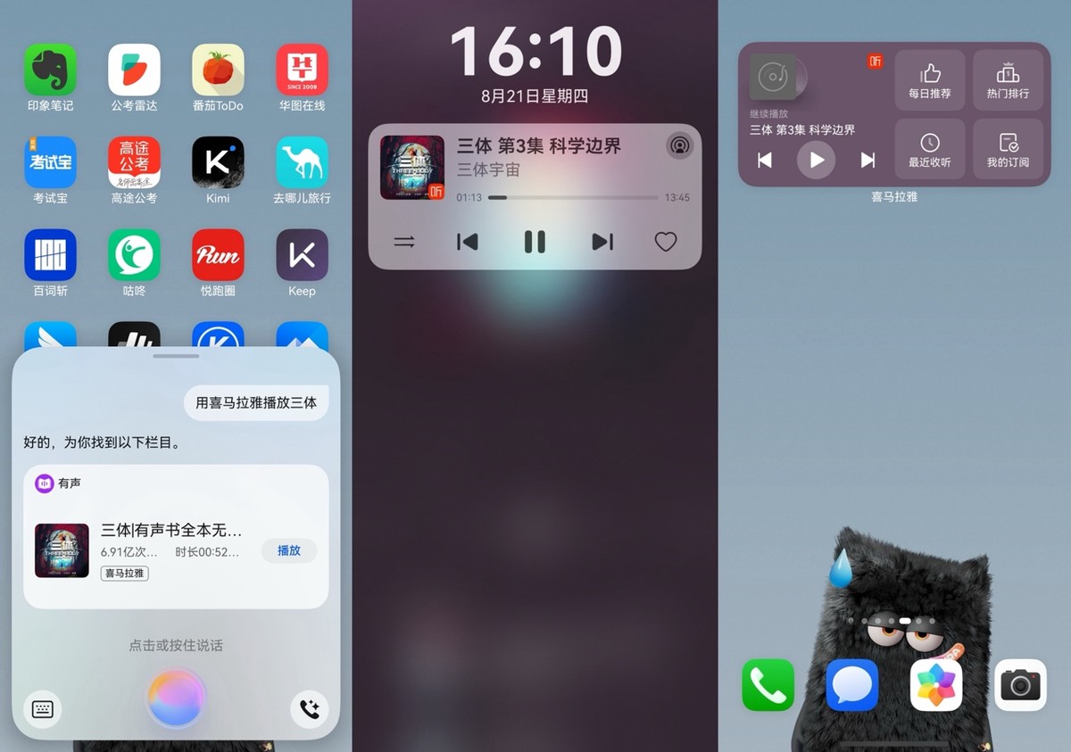 有时候只听音乐总是让人昏昏欲睡,我还会用鸿蒙版喜马拉雅听播客或有声书,还能听点故事或摄入知识充盈大脑。在用华为账号一键登录后,对着小艺说“用喜马拉雅播放《三体》”,它就会自动弹出喜马拉雅的链接推荐,点击即可播放,省去手动搜索的麻烦。要是之前听过,小艺建议还能推荐近期在听节目,无缝续上进度。更方便的就是它的服务卡片,桌面直接显示最近收听和热门排行入口,点一下就能接着听。