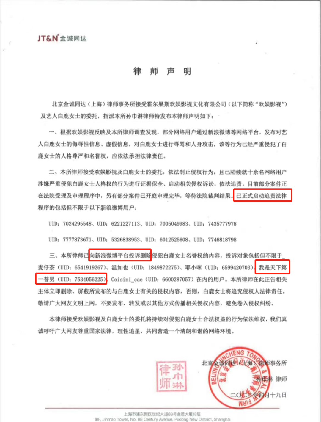 随后,白鹿的公司发表严正声明,表示侮辱性信息、虚假信息严重侵犯了白鹿女士的名誉权,已采取法律武器维权。公司方晒出的具体的律师声明中指出,已经对一些微博用户追责,同时还警告“我是天下第一普男”等用户立即删除有关白鹿女士的内容。