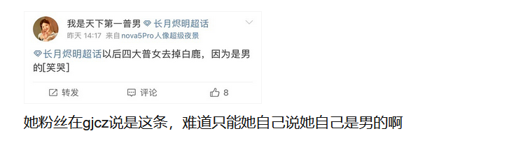 而她的另一则发言则是跟风最近网上的“娱乐圈普男普女”,称“白鹿不应该被评为普女,因为她是男的”。