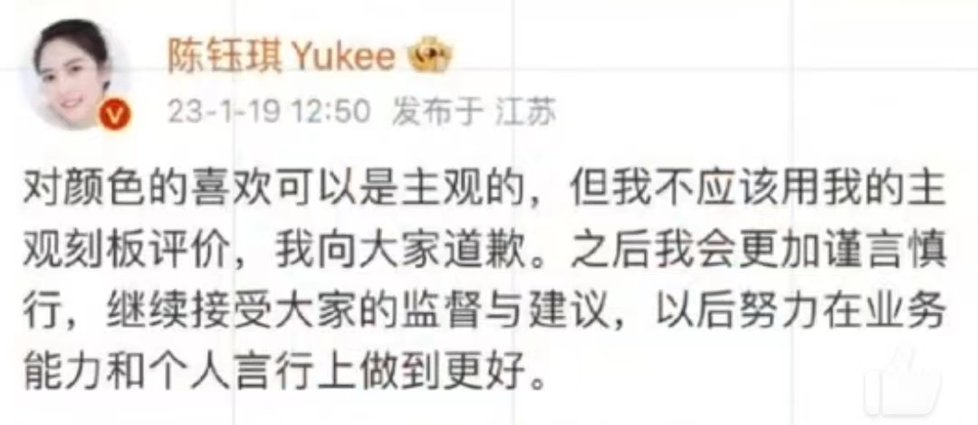 其实娱乐圈女明星关于“娘”这个话题的发言翻车,白鹿并不是第一人。曾经陈钰琪就因为在拍摄花絮中称“粉色很娘诶”而受到吐槽。不过她在第一时间就选择了道歉,称这是自己的刻板印象,以后会更谨言慎行。