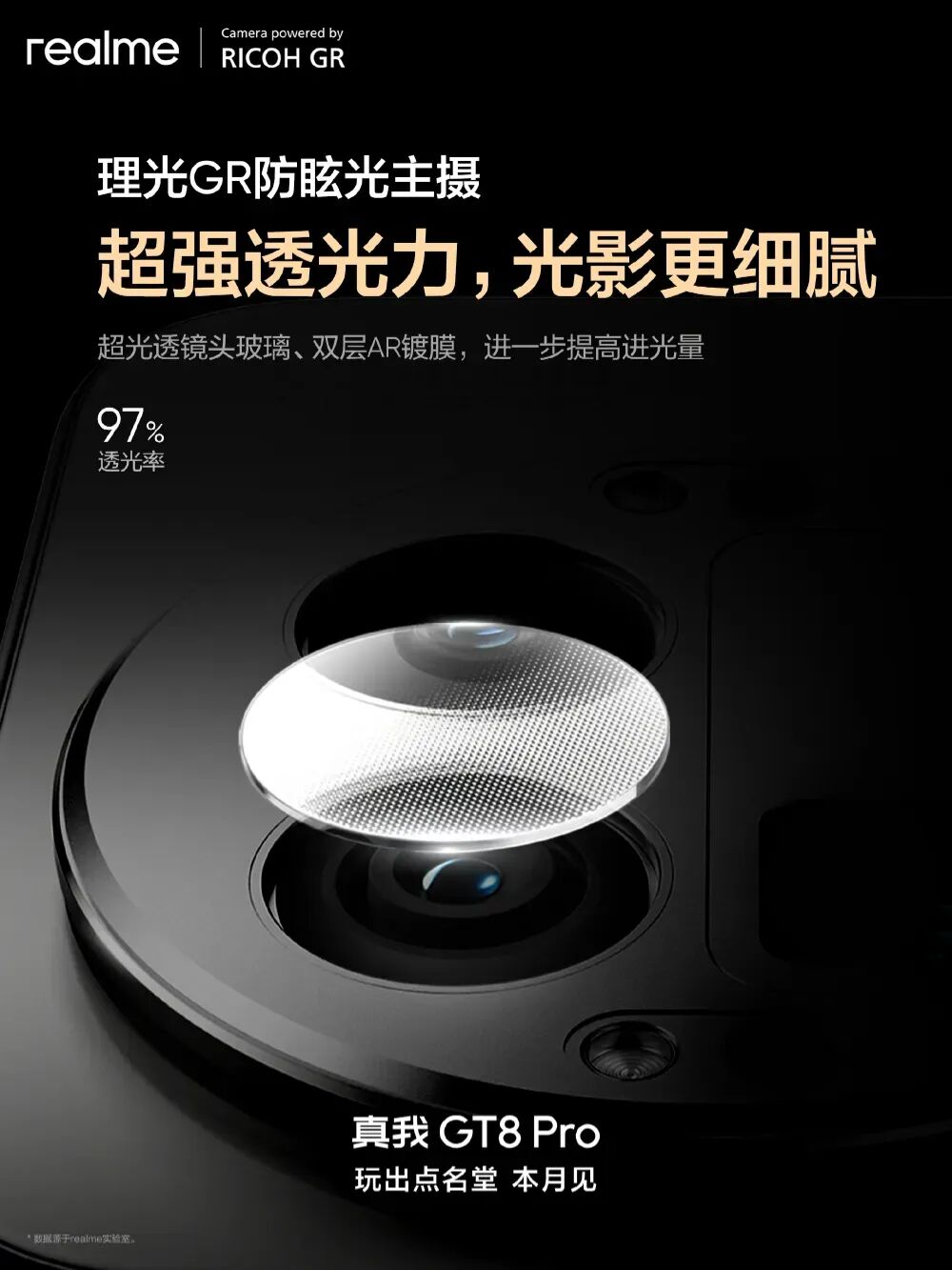 真我GT8 Pro搭载理光GR防眩光主摄。理光GR光学标准认证,理光GR团队严格验收,已通过防眩光、低畸变、高解析力、低色差的专业相机级标准检验。