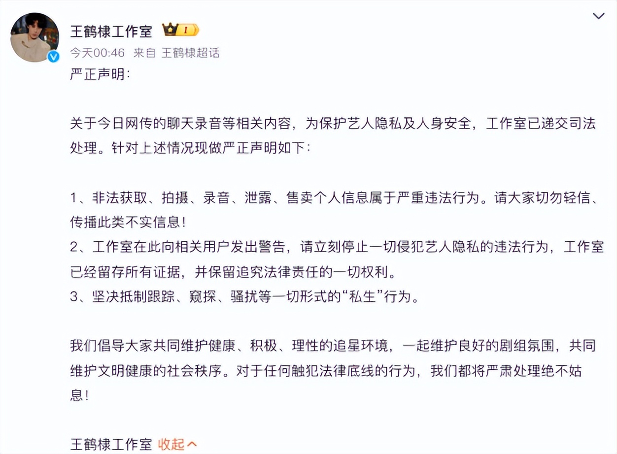 不过,王鹤棣工作室的反应那叫一个迅速。8月26日凌晨,工作室就发布了严正声明,明确表示网传的聊天录音等相关内容,为保护艺人隐私及人身安全,已经递交司法部门处理。