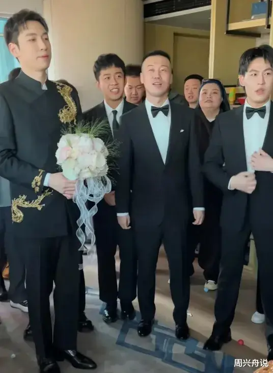 显而易见,王九龙当日装扮儒雅俊朗。有别于传统新郎身着高档西装,他选择了一身金色长龙盘绕的改良中山装,新颖独特又别具匠心。但仔细端详,网友忍不住戏谑道,王九龙这身行头,颇有五星级酒店门童的感觉,实在是太过出戏。