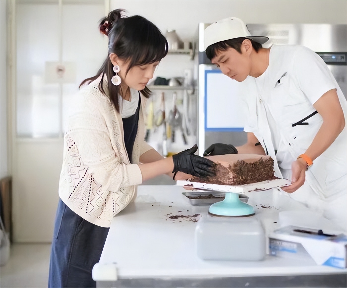 第一次做巧克力蛋糕,但生活多年的夫妻俩默契十足,完全没有想象中的手忙脚乱。