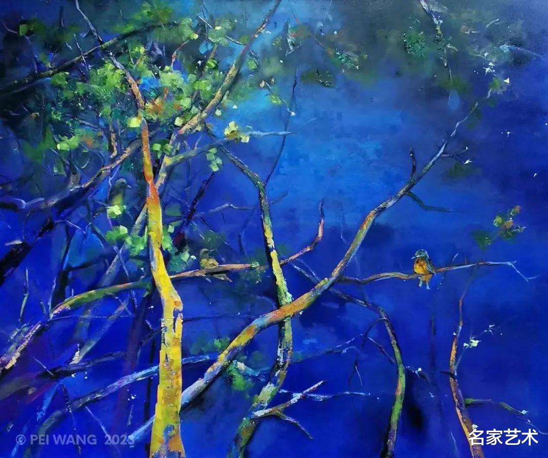画家王培的这幅《数星星》油画与文字让众多观众驻足并沉醉于湛蓝、迷思的夜空······