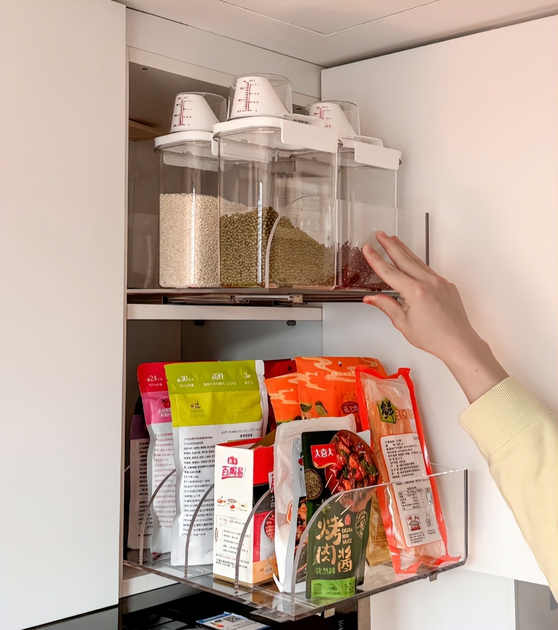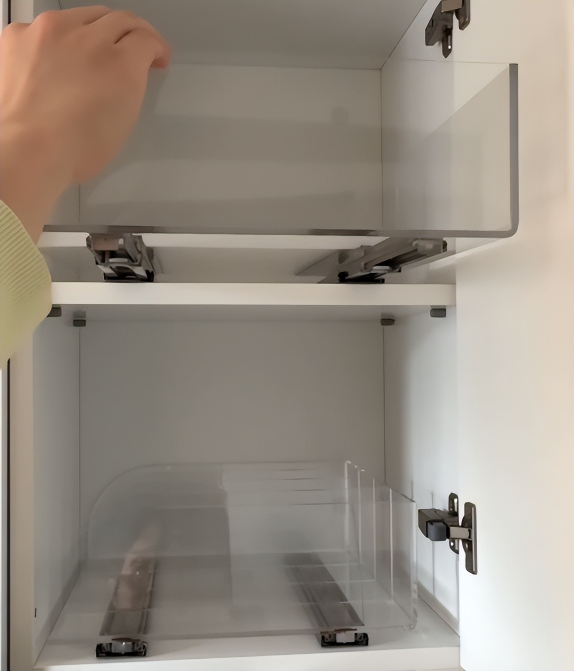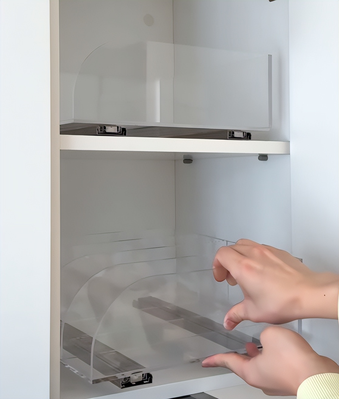 只需要在网上买两个亚克力的托盘,再买几个滑轨,用纳米胶粘贴在柜子里面,这样就可以把托盘往外拉了,找东西也方便。