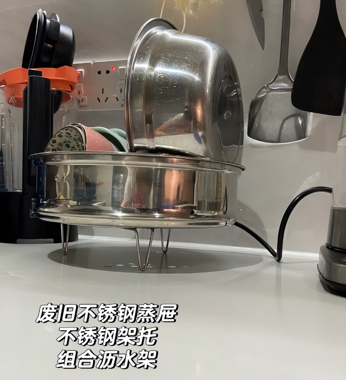 我妈说,只需要一个笼屉,搭配着几个不锈钢支架,这不就是一个碗筷沥水架吗?