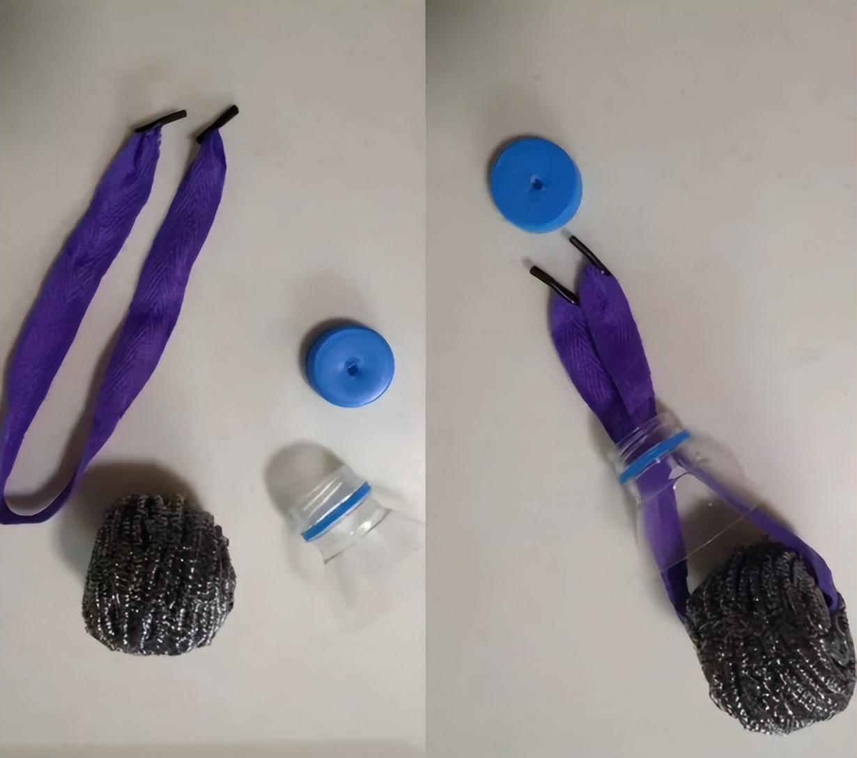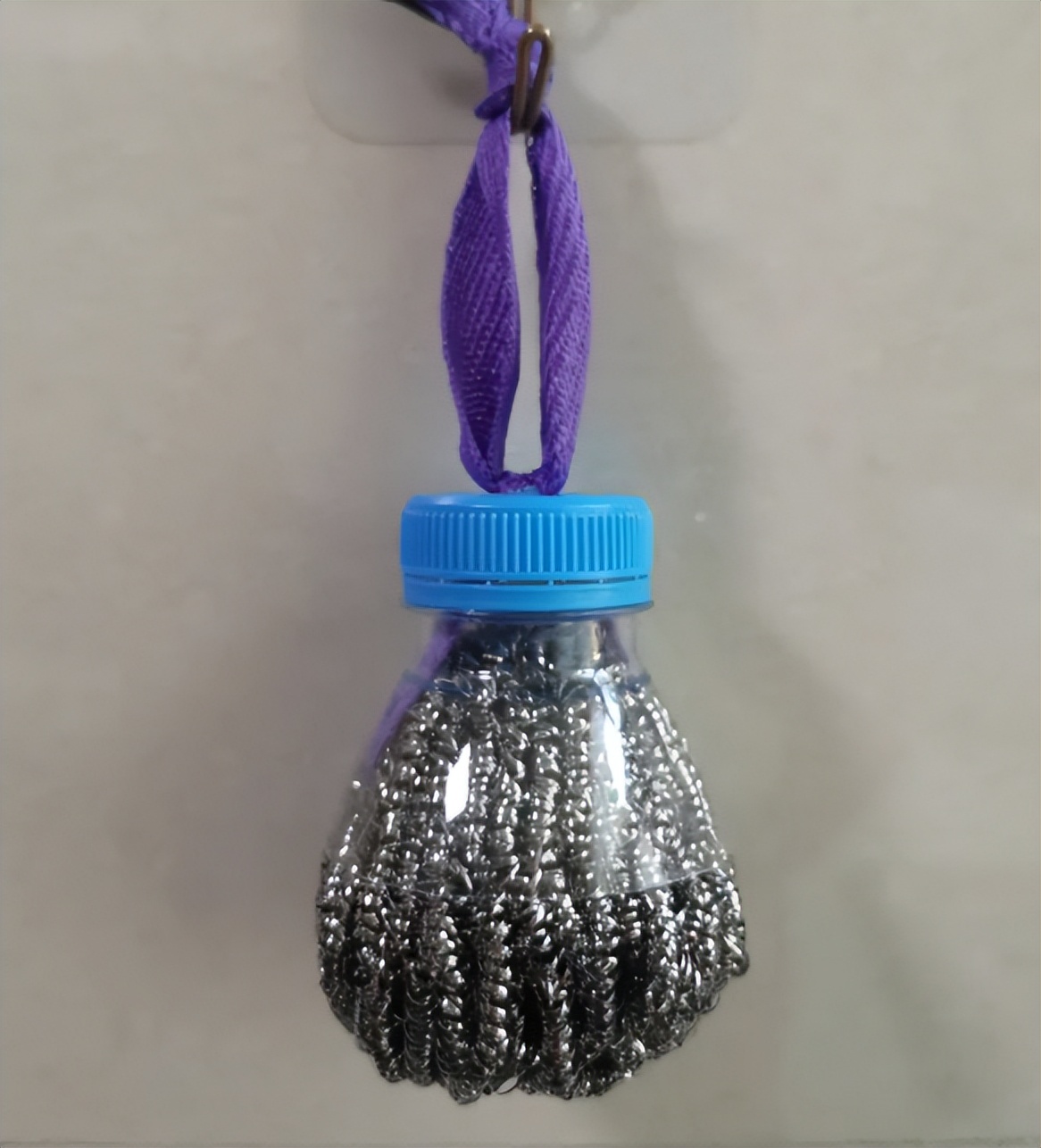 把绳子穿过钢丝球,把瓶盖穿个孔,把绳子从瓶盖中穿过去,用着很方便,不用的时候还可以挂起来。