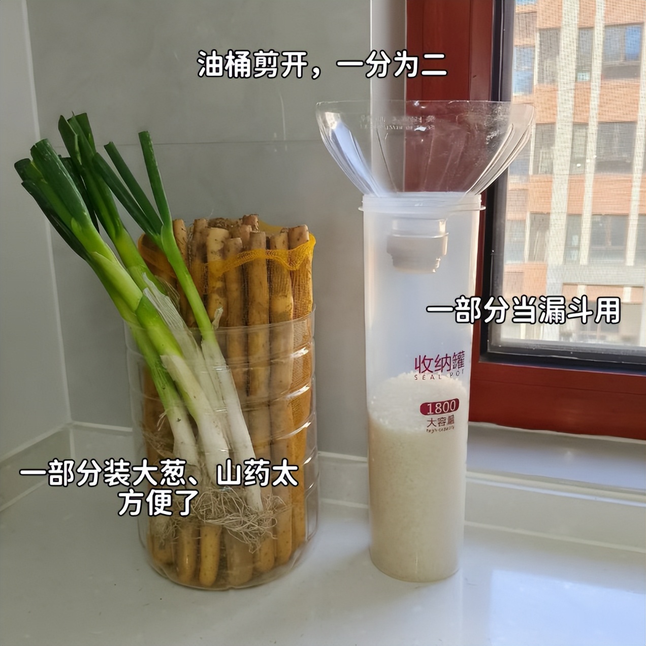 解决起来很简单,准备一个喝水的大水桶,再把水桶一分为二,上半部分还可以当成漏斗用,下半部分刚好装大葱、山药。