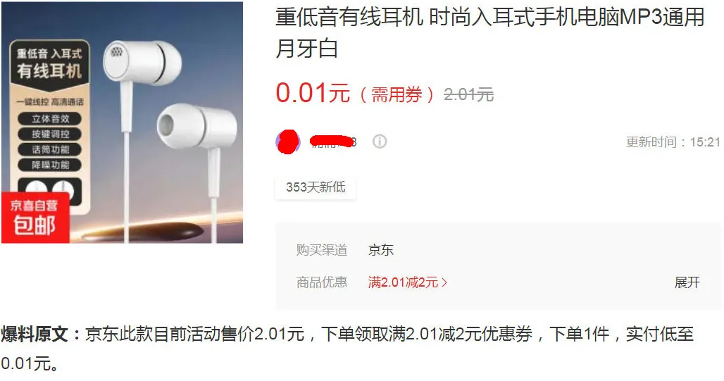 这是下午3点半张大妈的爆料,狗东京喜的入耳式耳机领券后包邮0.01元,基本就是白送了。我翻了一下用户晒单,大多数人是3块钱成本买的,本身也不贵,但白嫖更酸爽。