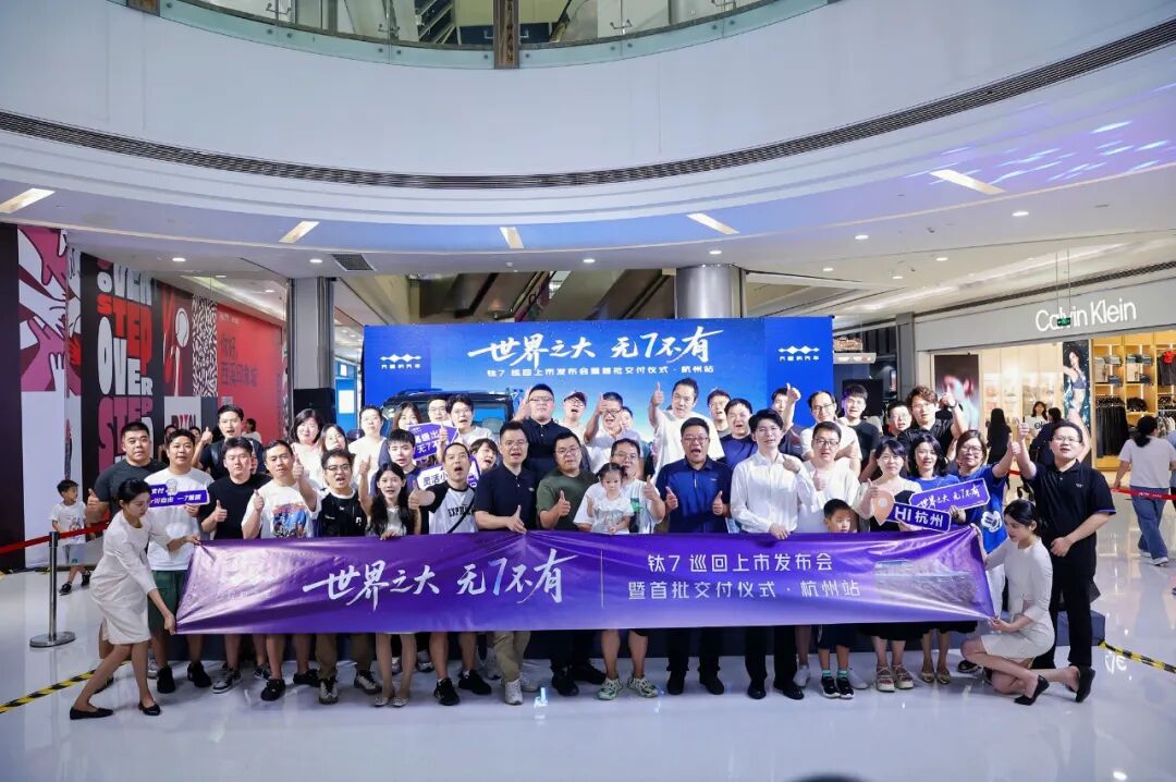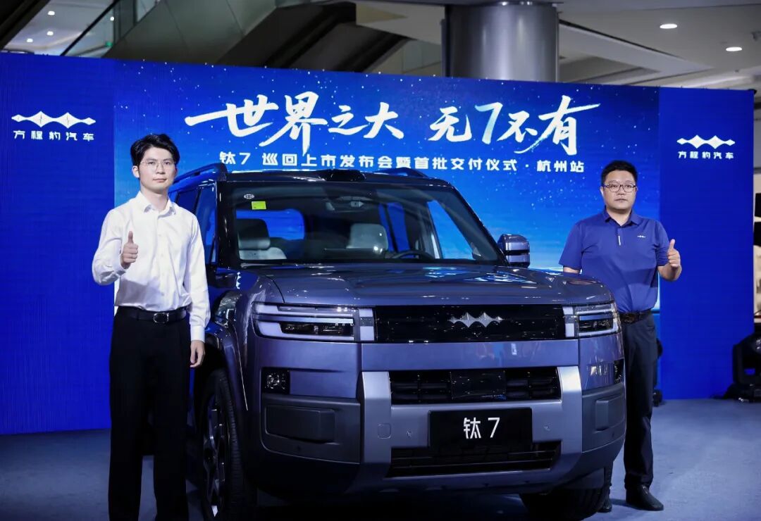 2025年9月19日晚,“方程豹钛7巡回上市发布会暨首批交付仪式·杭州站”于西溪印象城隆重举行。方程豹汽车销售事业部浙闽战区 副总监姜颖俊先生、大区经理陈祺先生、运营经理刘松先生等领导,与杭州地区媒体代表及首批新车用户齐聚现场,共同见证“科技大空间SUV”钛7的正式亮相。新车推出135KM两驱Pro版、200KM两驱Max版、190KM四驱Max版、190KM四驱Ultra版等4款配置,价格区间17.98万元-21.98万元,以硬派基因与全能实力重塑都市家庭出行新标杆。