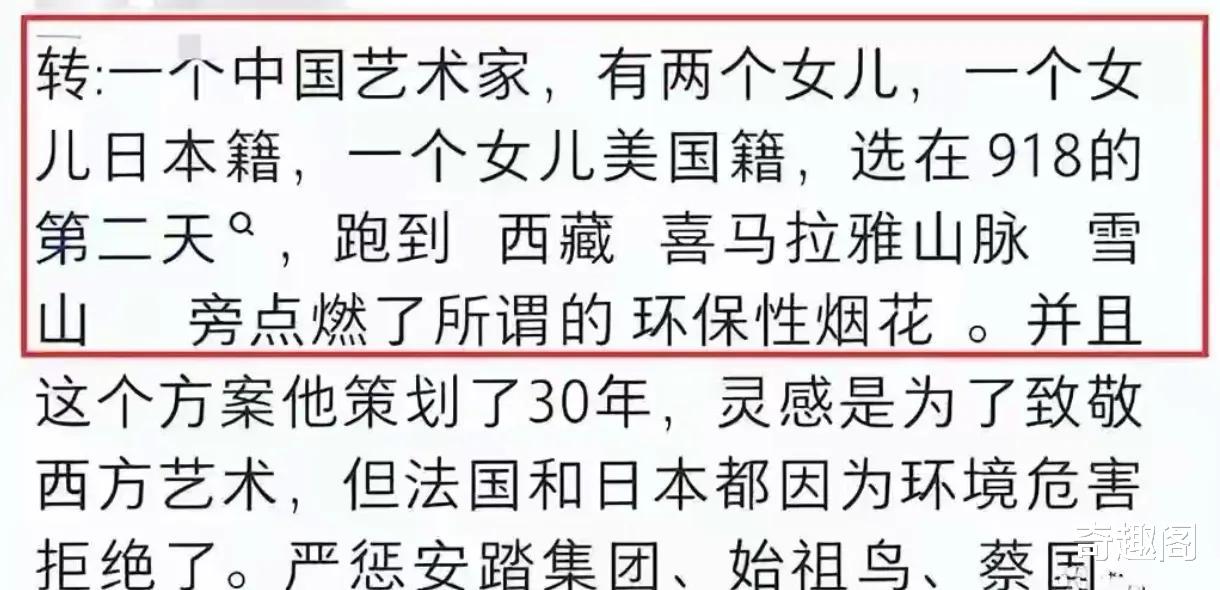 然而,此次争议事件发生之后,蔡国强被指出其实就是一位精致的利己主义者。为了自己的名和利,竟然在喜马拉雅山脉放烟花,甚至不惜破坏脆弱的高原生态环境。事实上早在1989年蔡国强就有了《升龙:为外星人作的计划第二号》的草图,为了实现目的,他先后去过法国和日本,最终却因为破坏环境被拒绝。而这一次,他却祸害了喜马拉雅山脉。