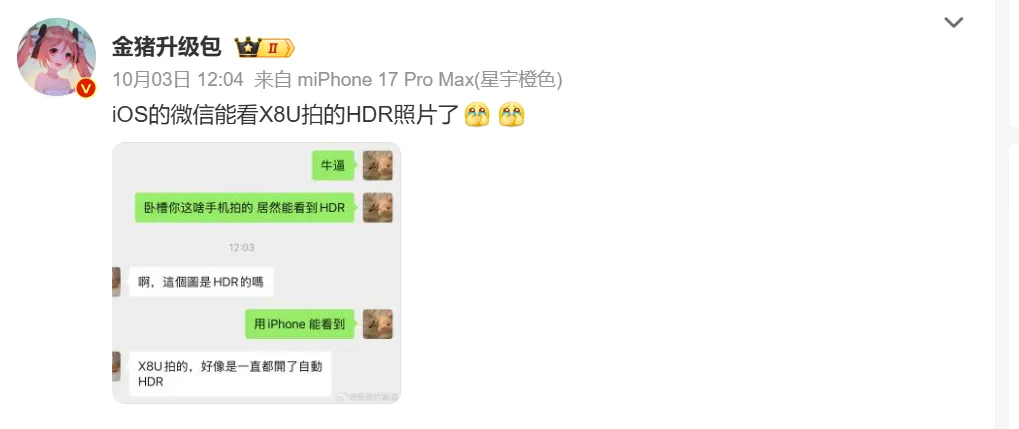 微信默默升级了图片显示!现在 iPhone 用户互相发 HDR 照片,点“查看原图”的时候,画面会闪一下,亮度、色彩一下子就上去了,HDR 效果完美呈现。