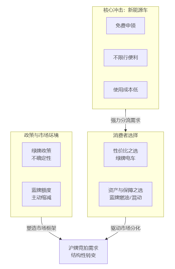 | 新能源车冲击 | 免费申领绿牌,且享受不限行政策。购买新能源车可直接节省约9万元的牌照费用。 | 强烈抑制 |