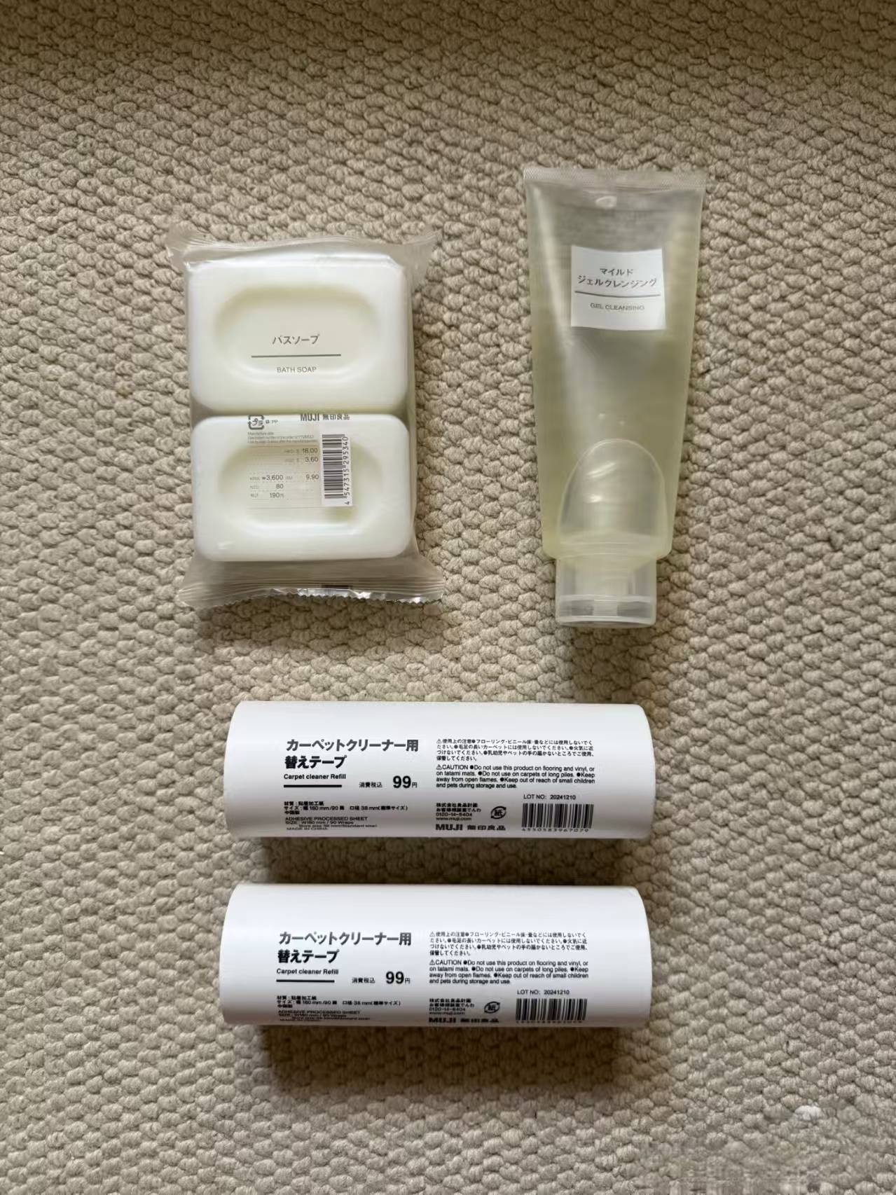 最后必须夸的是地毯清洁剂替换装!家里铺了地毯的朋友真的懂,咖啡渍、零食渣简直是“居家噩梦”——这个替换装是配MUJI地毯清洁机用的,倒进去之后喷在污渍上,等个几分钟拿布一擦,基本能把大部分日常污渍都带走,而且味道是淡淡的清洁剂香,不会像有些清洁液齁得慌。重点是它只要99日元(换算下来才几块钱),买两包囤着,平时打扫卫生的时候随手用,比请保洁划算太多!