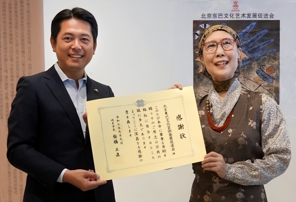 岐阜市市长柴桥正直先生接受北京东巴文化艺术发展促进会张旭·塔尤拉姆会长捐赠习尚洪东巴大师为岐阜市立中央图书馆书写的《白蝙蝠取经记》