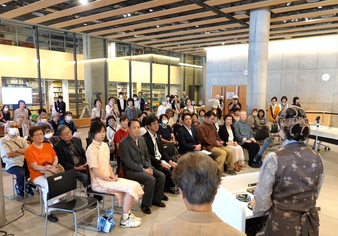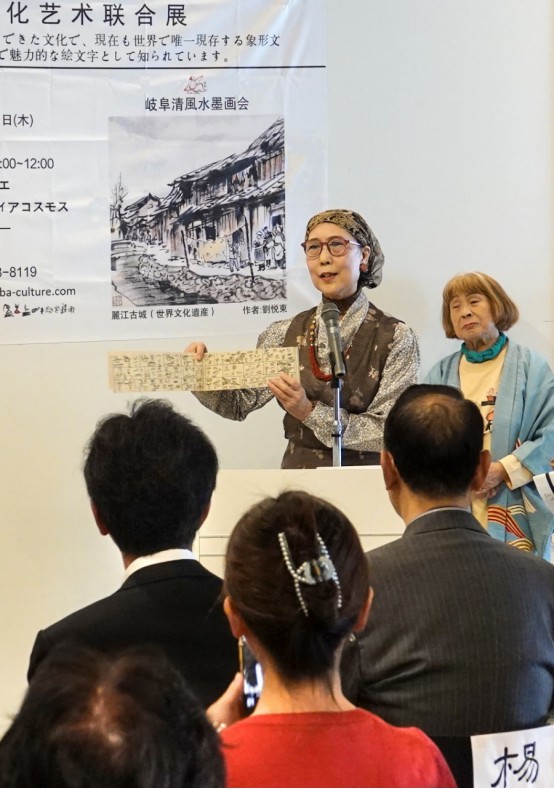 前岐阜议员市川尚子女士在开幕式用洪亮声音诵读她在东巴文绘画作品中写下的汉字诗歌