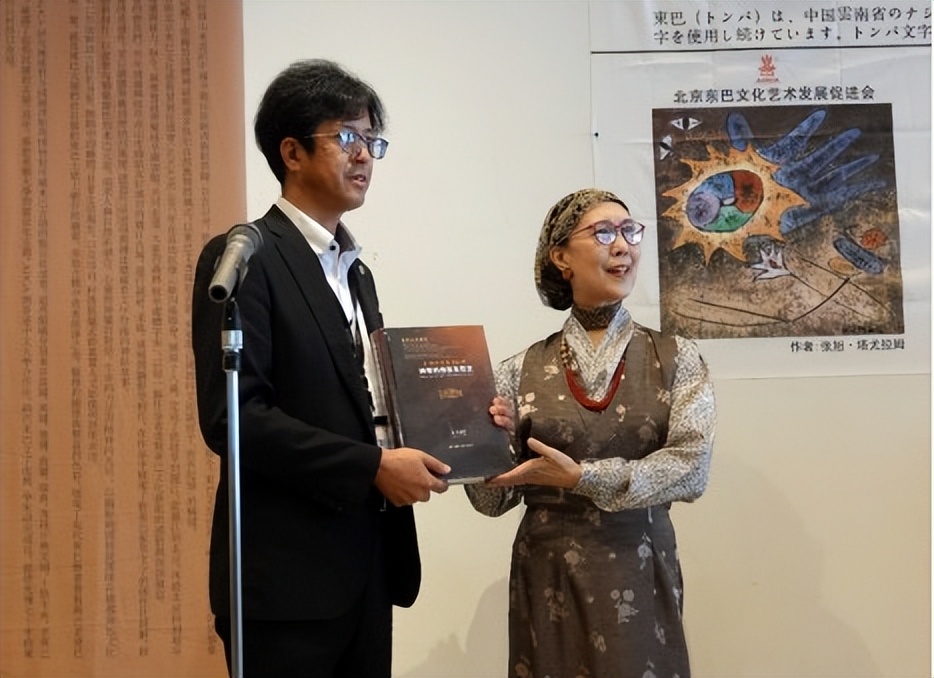 岐阜市立中央图书馆馆长长尾胜弘先生代表接受了著名纳西族学者蓝伟先生的研究专著《神奇的纳西东巴文》