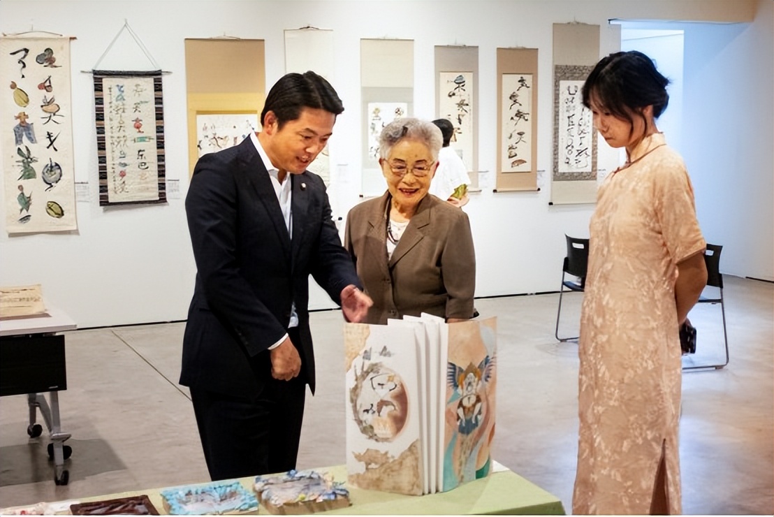 市长柴桥先生和岐阜前议员市川女士欣赏ADCA青年会员龙开元用东巴元素创作的旗书