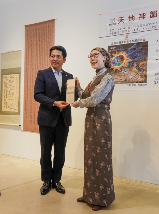 柴桥正直市长在开幕式当天的社交媒体平台发布消息:“我出席了日中东巴文化艺术联合展开幕式,并承蒙北京东巴文化艺术发展促进会张旭会长惠赠东巴文书籍,谨此致谢。东巴文字是云南省少数民族纳西族历经千年传承的文字,也是世界上唯一现存的活的象形文字。