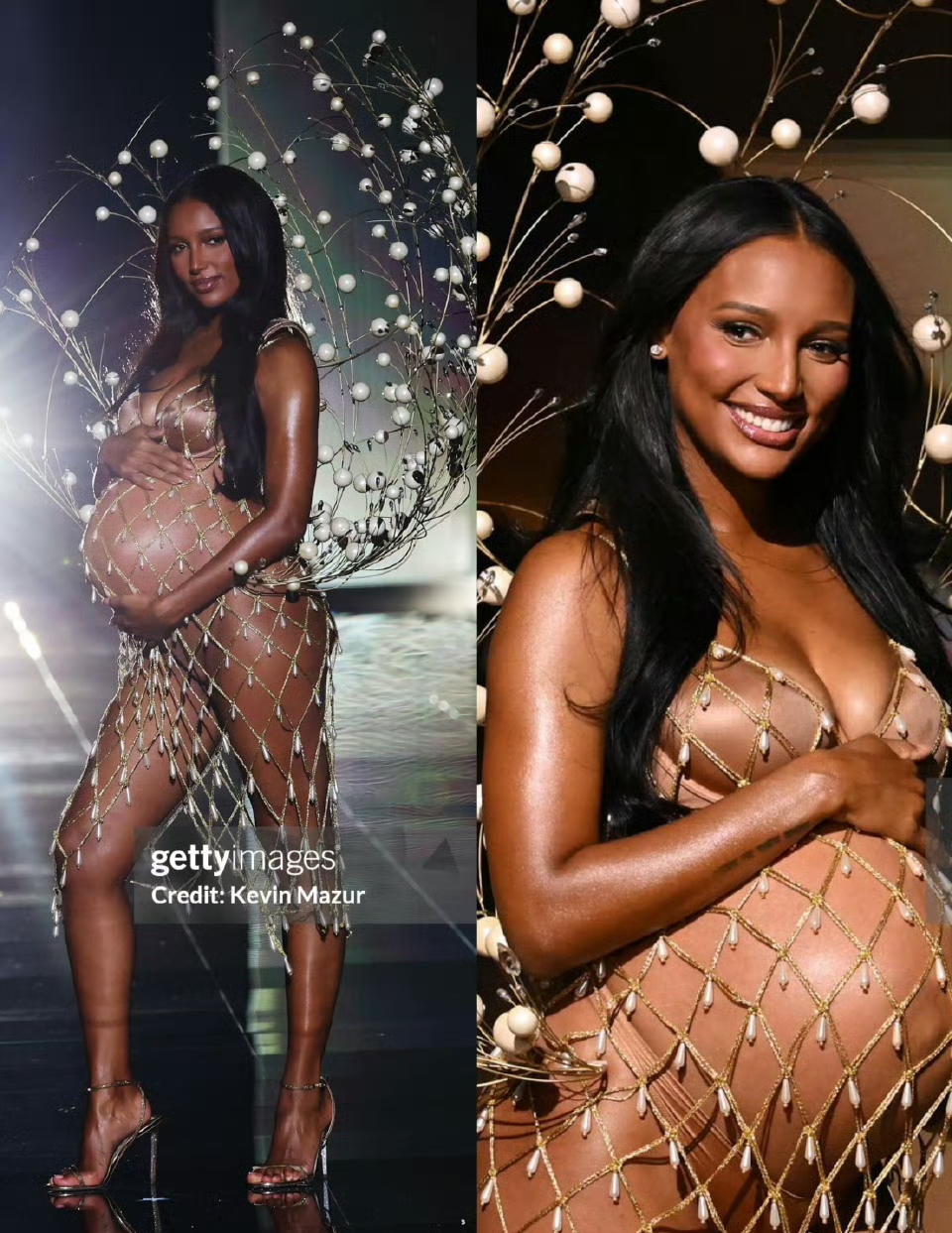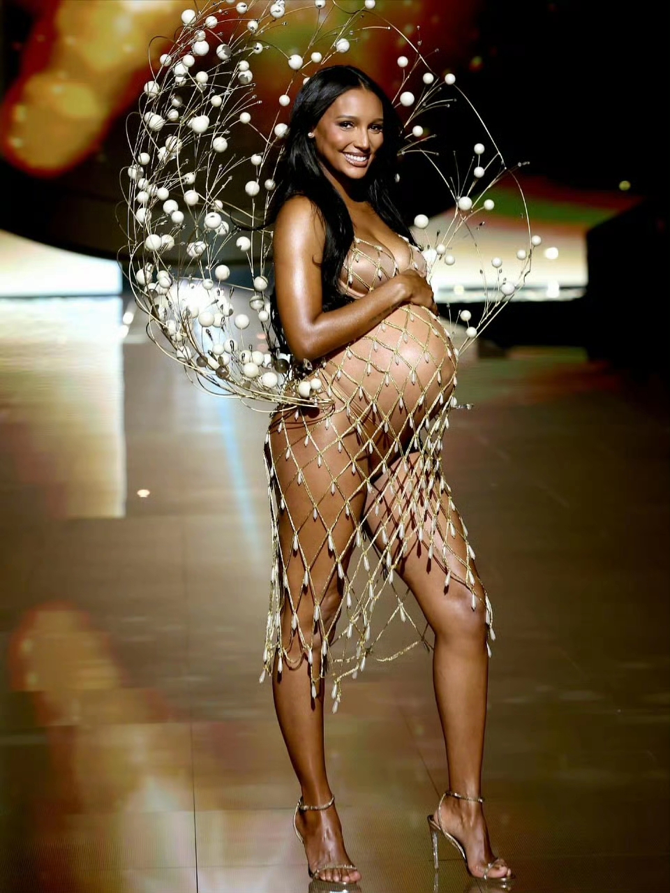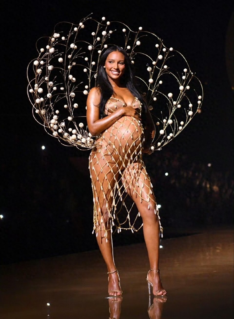 这可不是什么行为艺术,是维密官方亲自策划的历史性开场,金色流苏礼服、珍珠贝壳翅膀,聚光灯下她每一步都走得稳,孕肚曲线清清楚楚,一点没遮没掩。