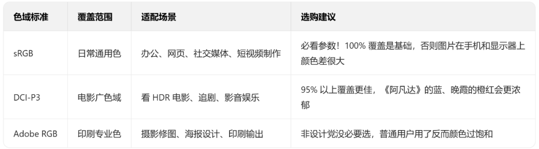 1. 通俗理解:显示器的 “调色盘范围”,全了才逼真