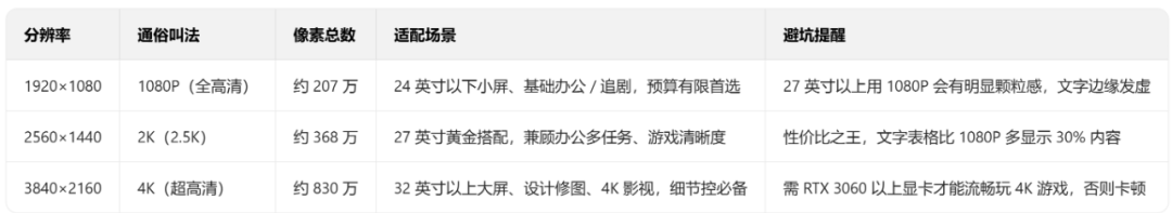 关键:看PPI(像素密度),27 英寸配 2K 的 PPI 约 108,肉眼几乎无颗粒感,是平衡清晰与体验的黄金组合。