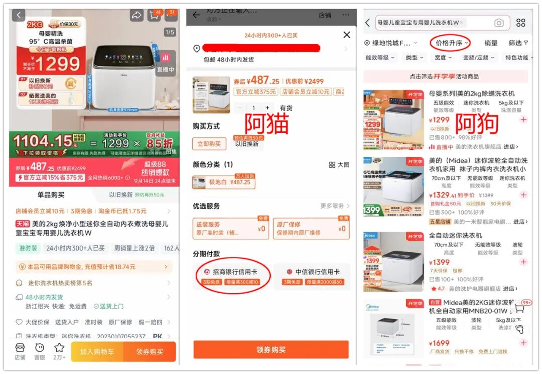 于是我用自己阿猫号测了一下,领完1299-799的券,再入会减10元,显示实付487元,再用招行信用卡3期免息,满300还能减10元,我的最低成本是477元,这还没算上淘金币,肯定不是最低价。而阿狗那边我用价格从低到高排序,这款目前最低1299元起。