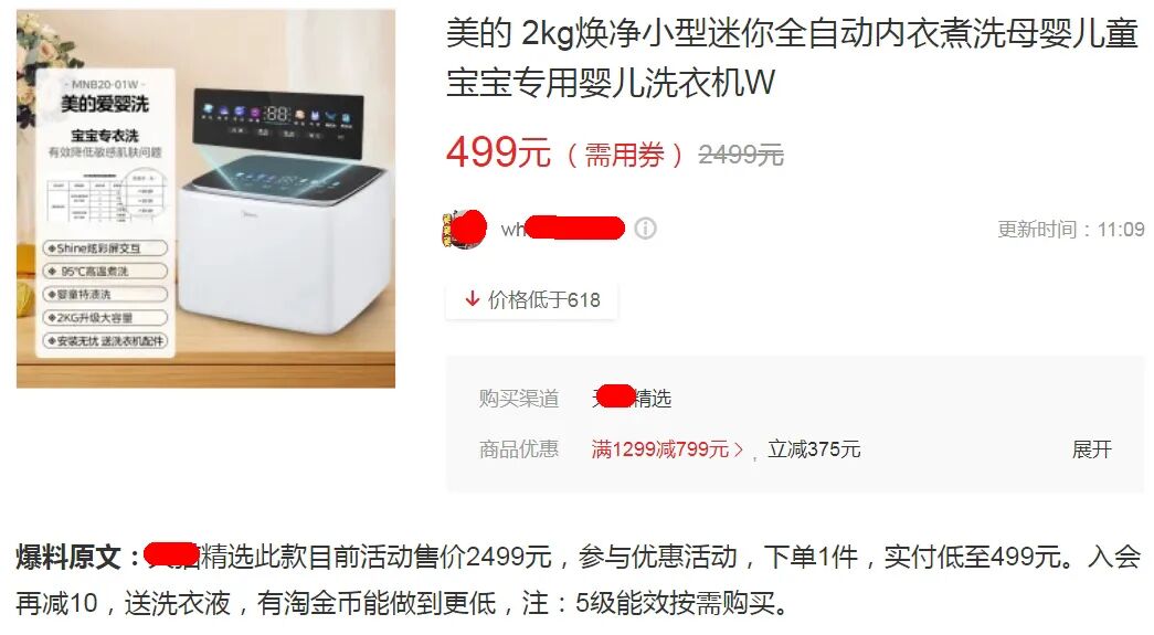 根据张大妈今早爆料,阿猫原价2499元的美的2KG儿童洗衣机,通过一系列操作实付499元,晒图送1KG洗衣液,有淘金币可以做到更低。我定睛一看,从2499降到499,一夜暴降2000块?直接砍掉了前面的一位数啊。