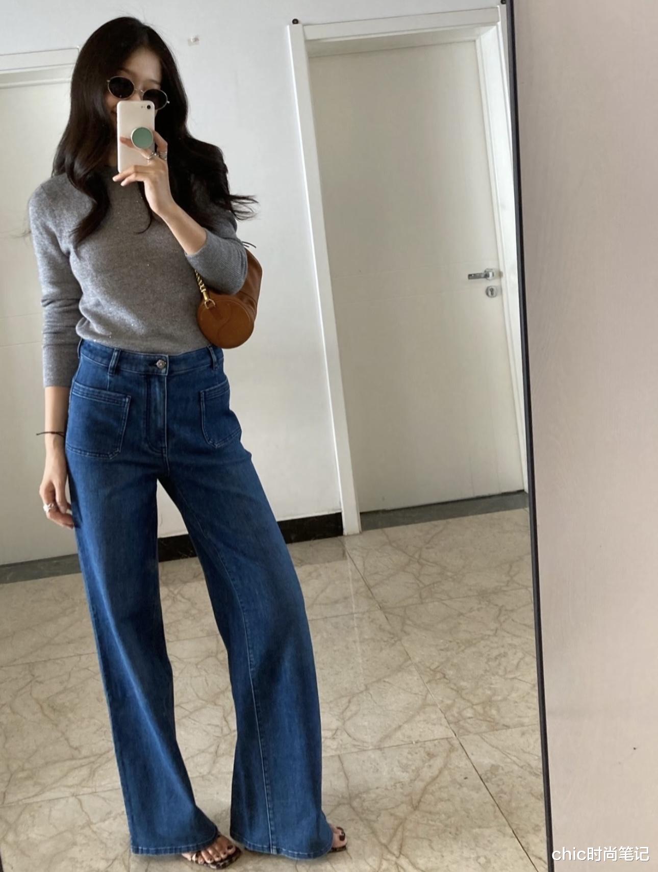 灰色针织上衣配上蓝色高腰牛仔裤,搭配棕色小包,色彩对比度有了!微辣阔腿的设计超显腿长,完美“打造”身材比,OVV的设计总是能把实用和时尚兼具。