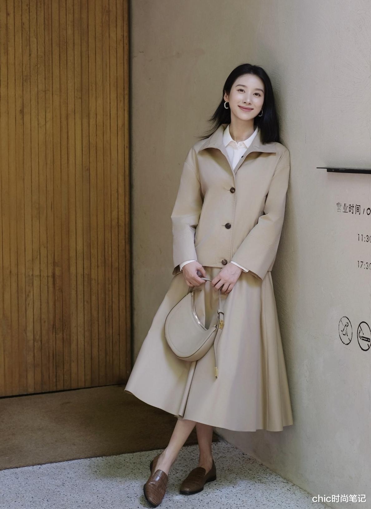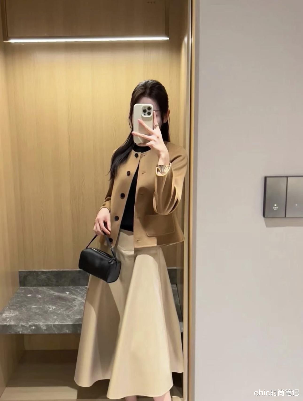 秋天是大地色系,驼色开衫搭配浅驼色半身伞裙,很有质感的 一套穿搭,深色和浅色的过度层次感与细节感绝佳。