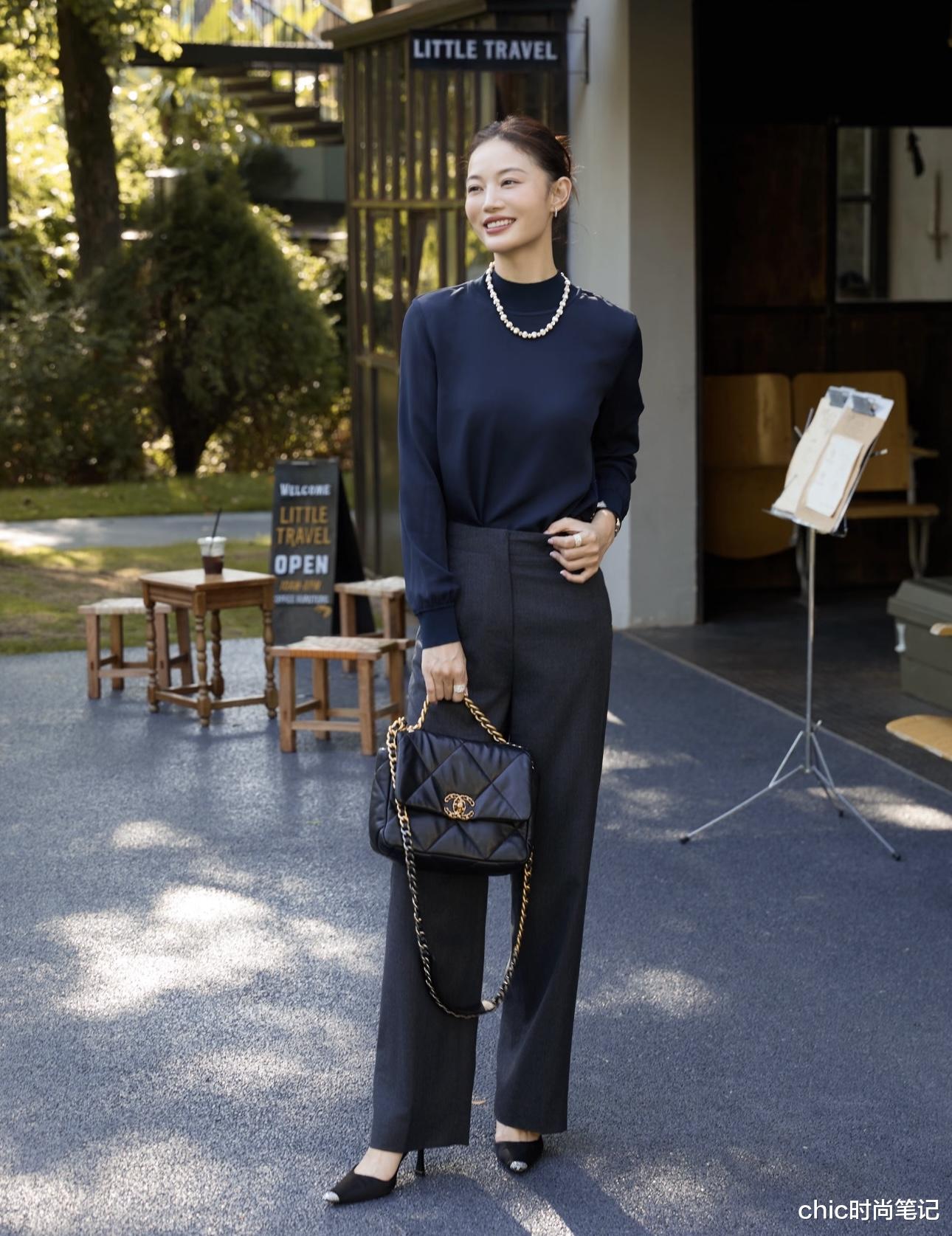 藏蓝色针织上衣搭配深灰色西裤,黑色包包和黑色高跟鞋的加持让整套穿搭在简约中透着优雅和干练,尤其是脖子上的珍珠项链点缀,让原本黑色系穿搭一下子亮堂起来。