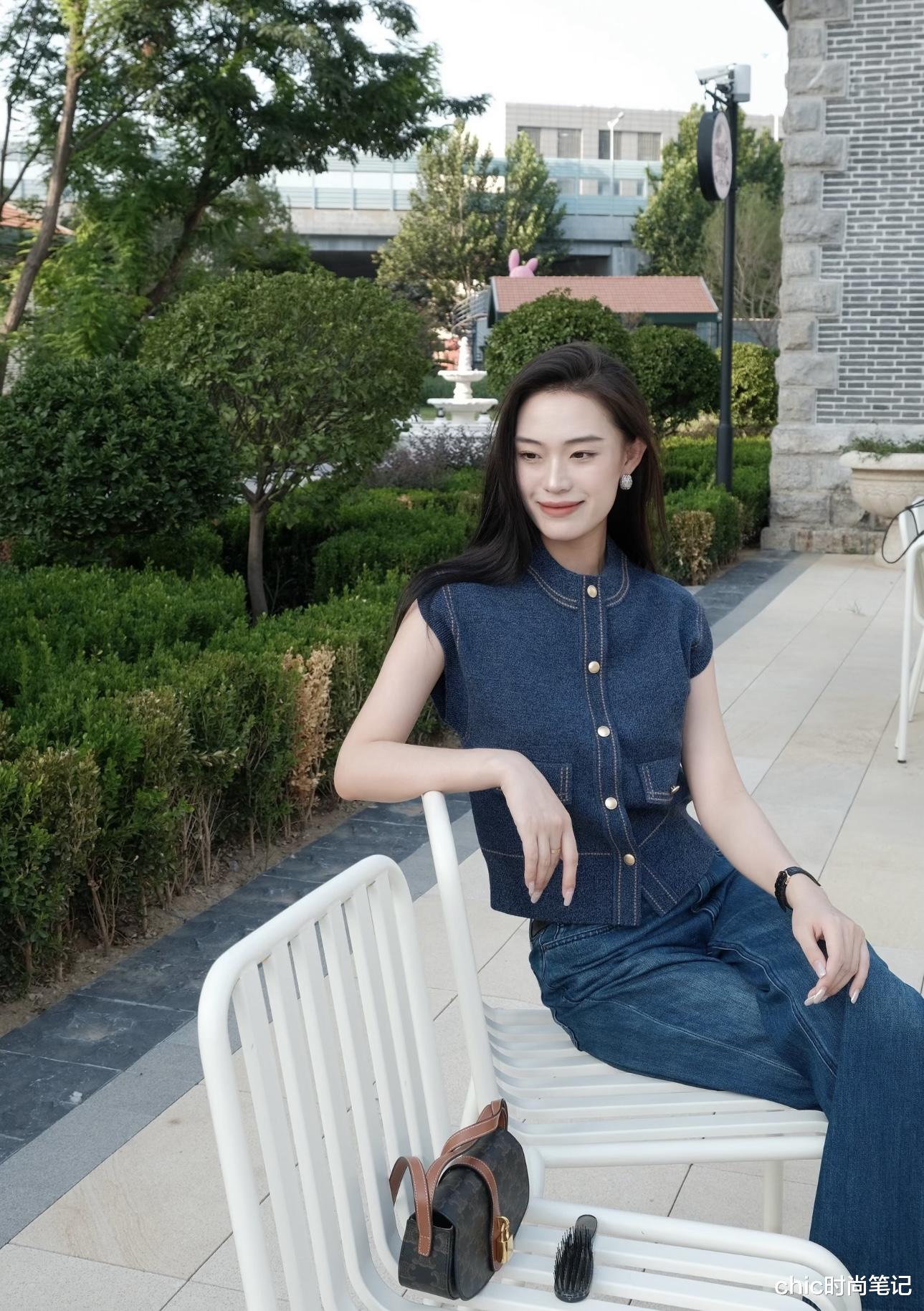 精致立体的牛仔上衣搭配深色牛仔裤,丹宁牛仔上衣搭配金丝线和金色纽扣,优雅且贵气,看似简单、随性的一套look,实则质感满满。