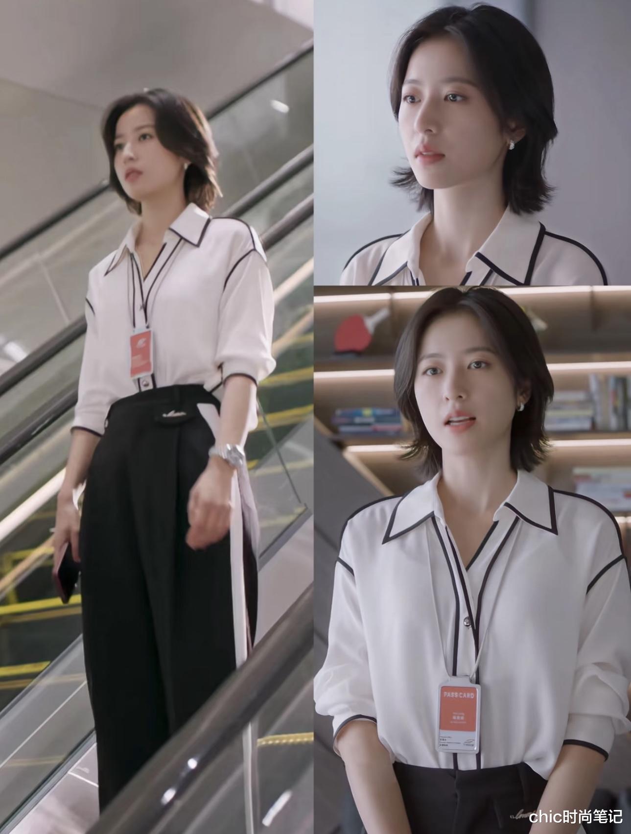 《爱情而已》里周雨彤的穿搭是非常经典的职场通勤风格,一套look也是来自于OVV,白色衬衫+黑色西裤,越是简单越能展现职场的干练和利落。