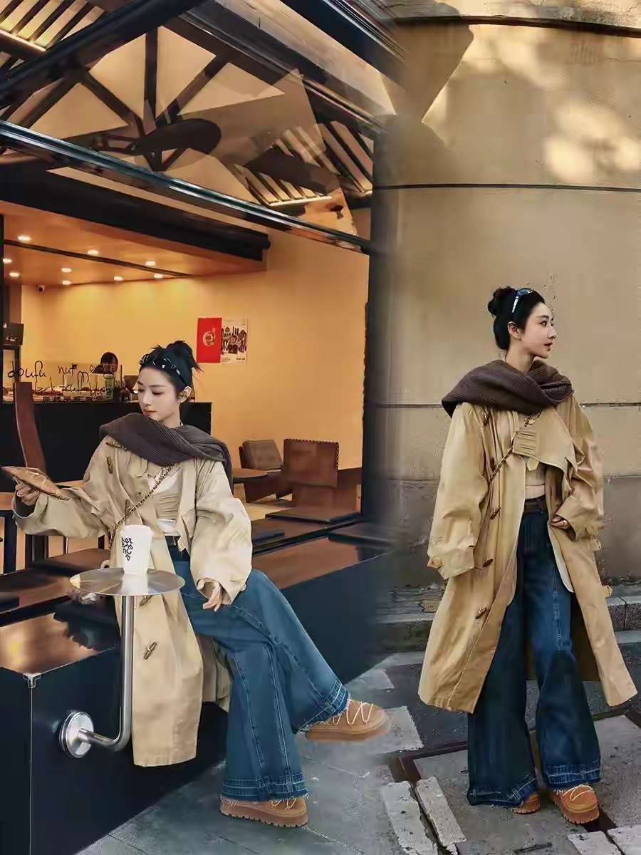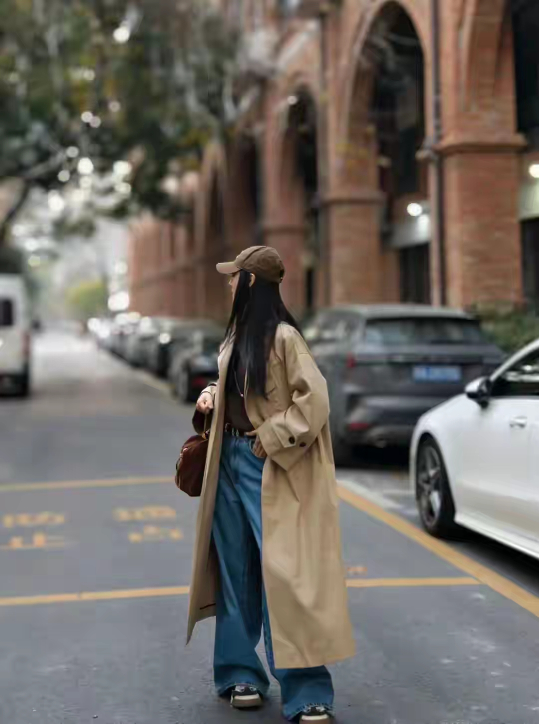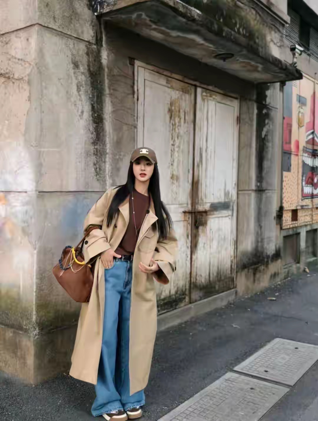 薇娅这件卡其色风衣,看起来比较贵气有范,内搭深咖色打底,下搭蓝色牛仔阔腿裤,这种慵懒风造型,潮流又时尚,彰显高大上气质!
