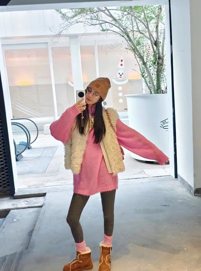 粉色的中长款毛衣外米白色皮草马甲,保暖又时尚,白色和粉色的碰撞,视觉上温柔又保暖,还比较衬肤色!