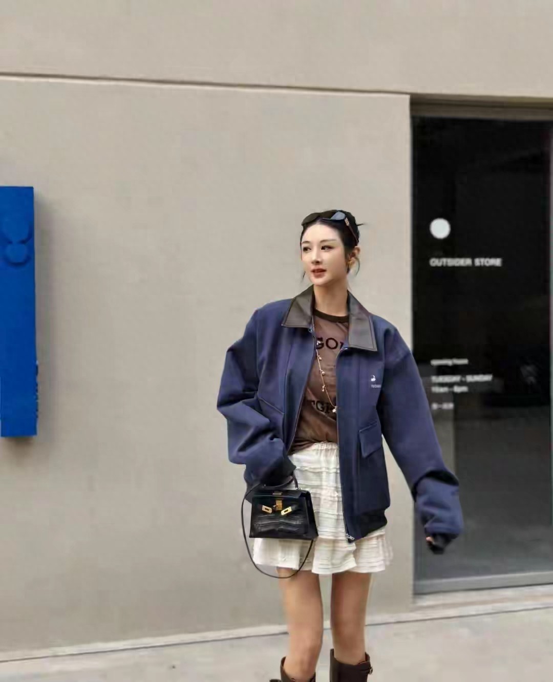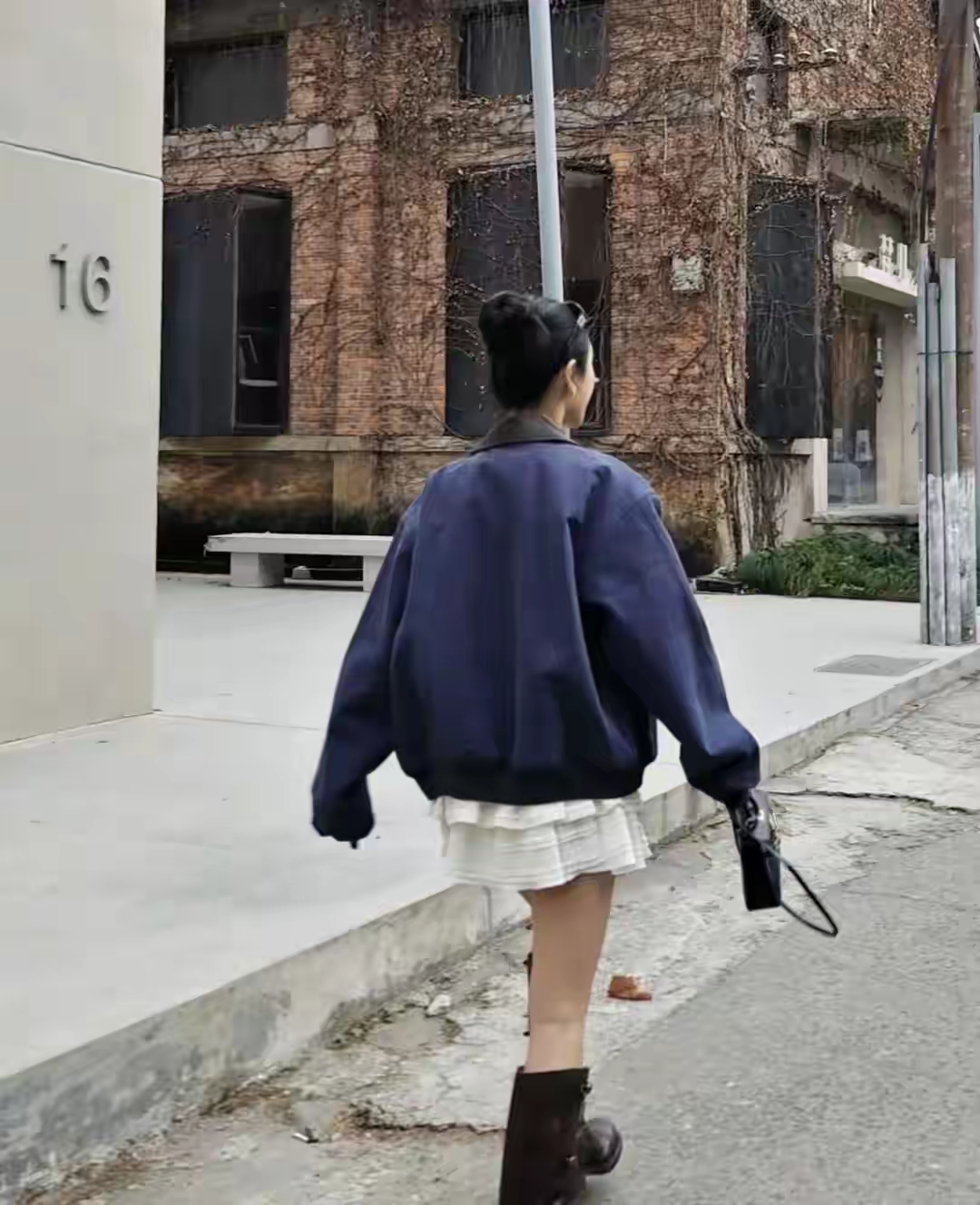 藏青色休闲外套,宽松舒服,能完美包容女性身材不足的地方,并且随意搭配,不挑身材,非常适合秋季穿搭!