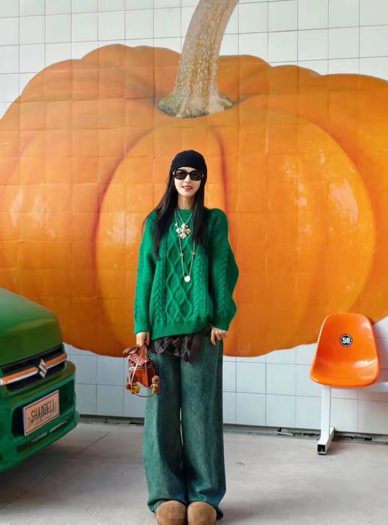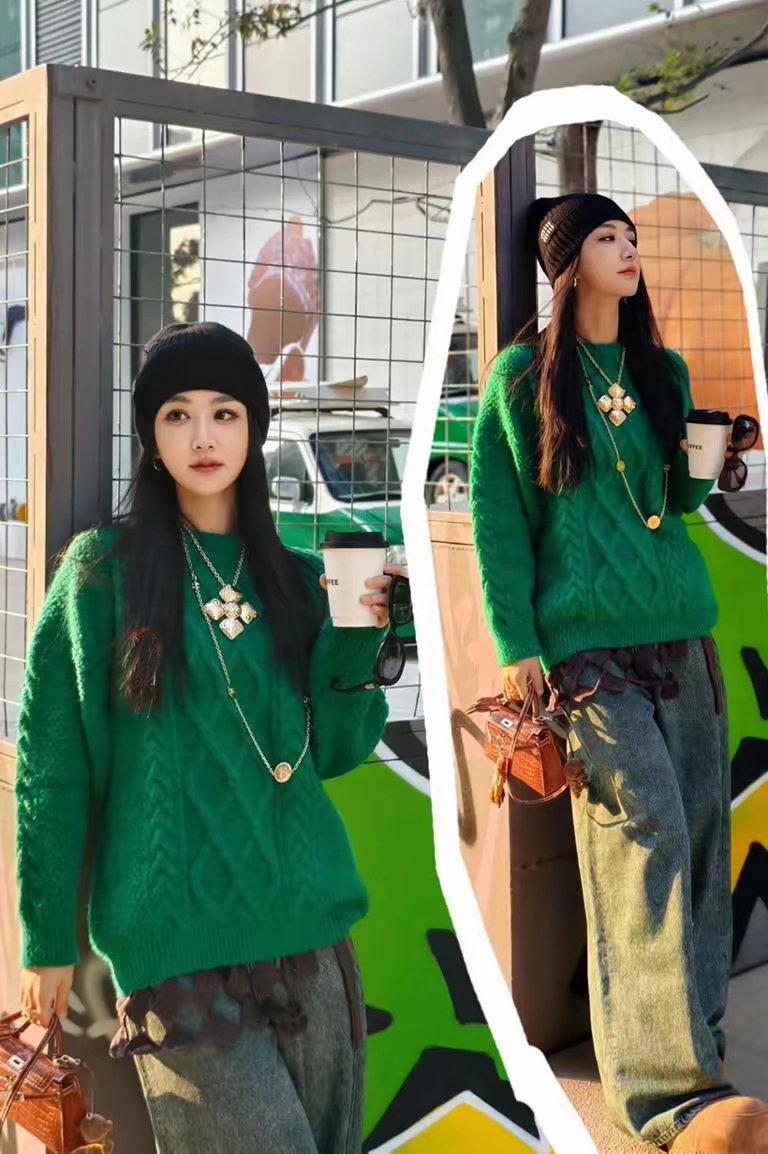薇娅这款绿色毛衫,看上去很舒服一,慵懒风造型,外穿内搭都不会出错,如果天气寒冷,里面还可以叠加打底或者衬衣。