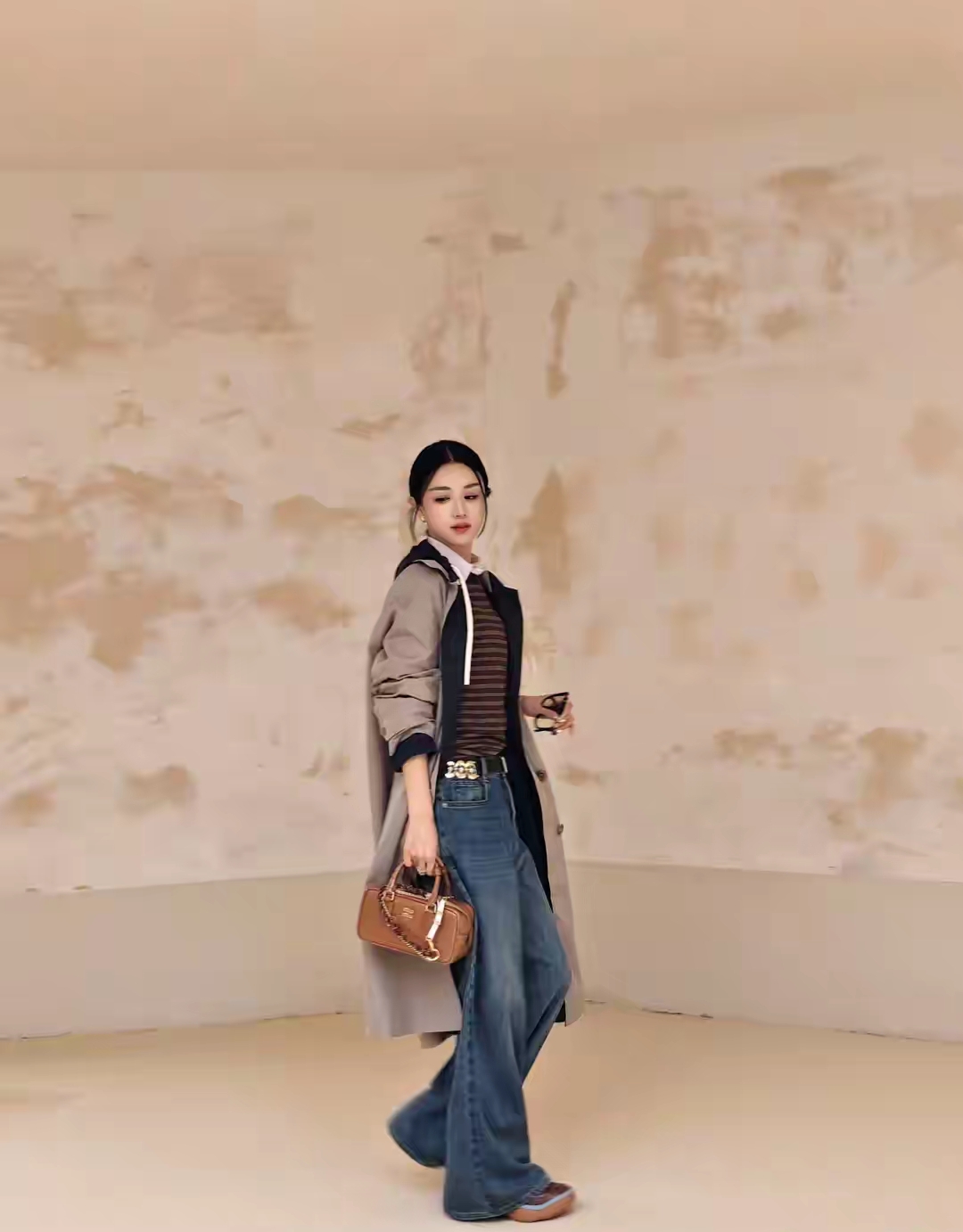 风衣搭配阔腿牛仔裤,真的是不挑身材,无论是梨形身材还是苹果型身材,都可以上身试试。然后再根据自己的服装色系,像薇娅一样选个自己喜欢的包包,也是秒变时尚女神!