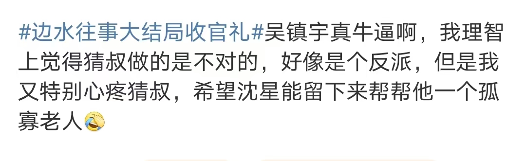 “我理智上觉得猜叔做的事不对的,好像是个反派,但是我又特别心痛猜叔……他一个孤寡老人。”