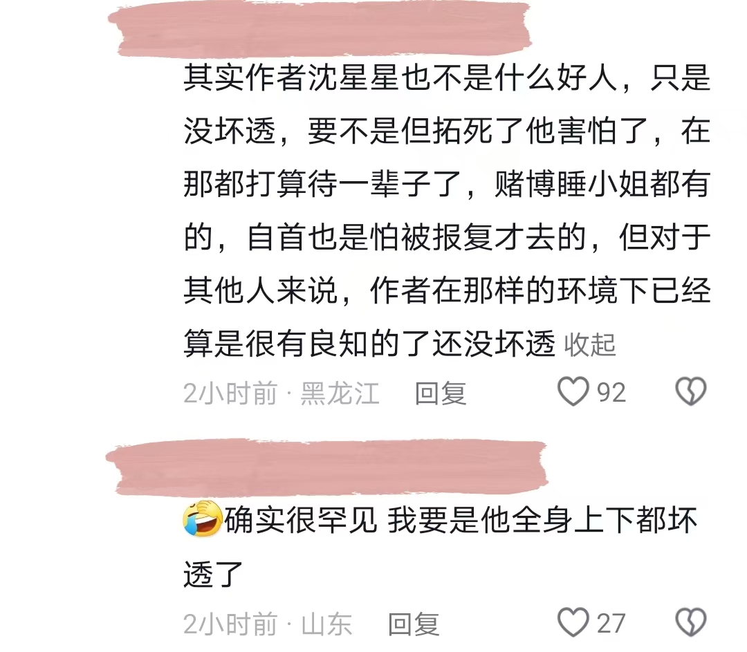 对比现实作者是带着恐惧生存,甚至害怕强烈到不得不去“自首”,惊恐哪天被猜叔报复来看。