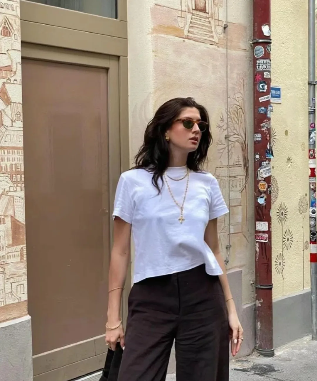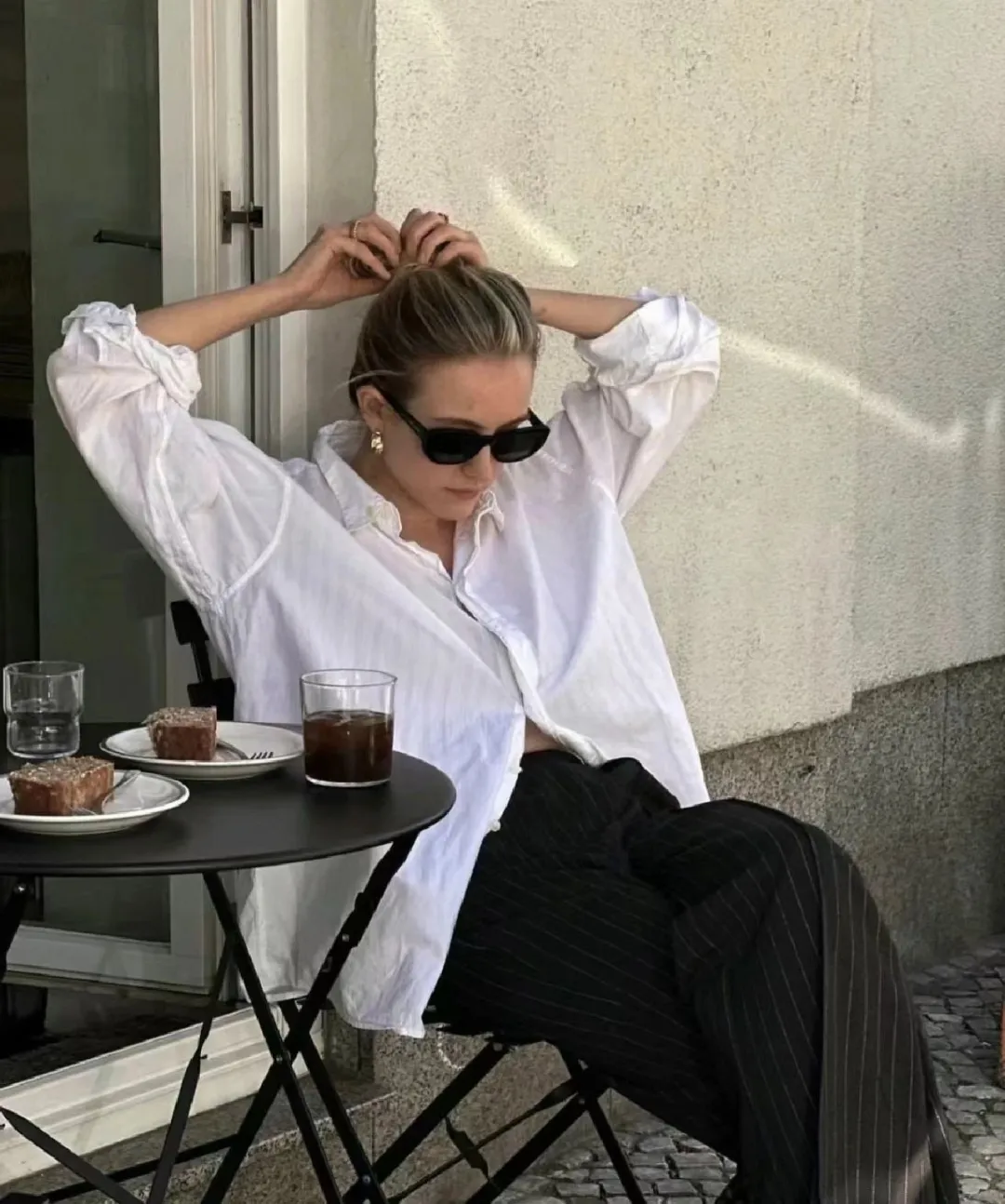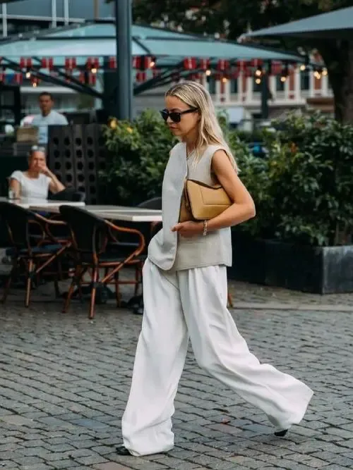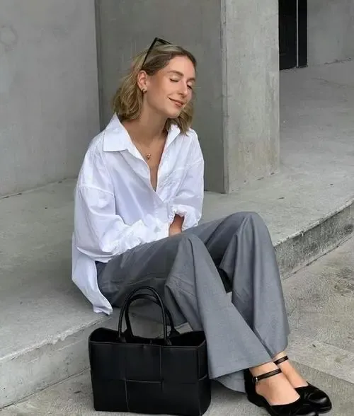 选择两种中性色去搭配,选择宽松舒适的白衬衫,搭配灰色阔腿西装裤,搭配简约的黑色包包,高级有质感