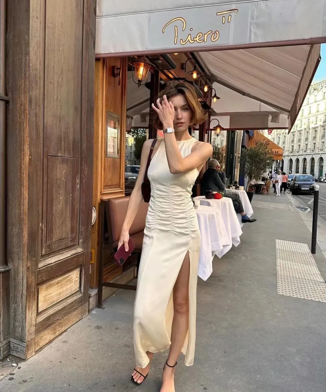 如果想要不费时的省心穿搭,可以选择一款修身的丝绸连衣裙,丝绸材质的面料质感高级、光泽度高,柔软、光滑、夏季穿着非常舒适。
